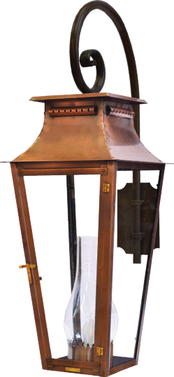 The vertical lines and curled bracket of this copper light add a European touch to any style of architecture. Available in natural gas, liquid propane, and electric. Available at bevolo.com. $1,400