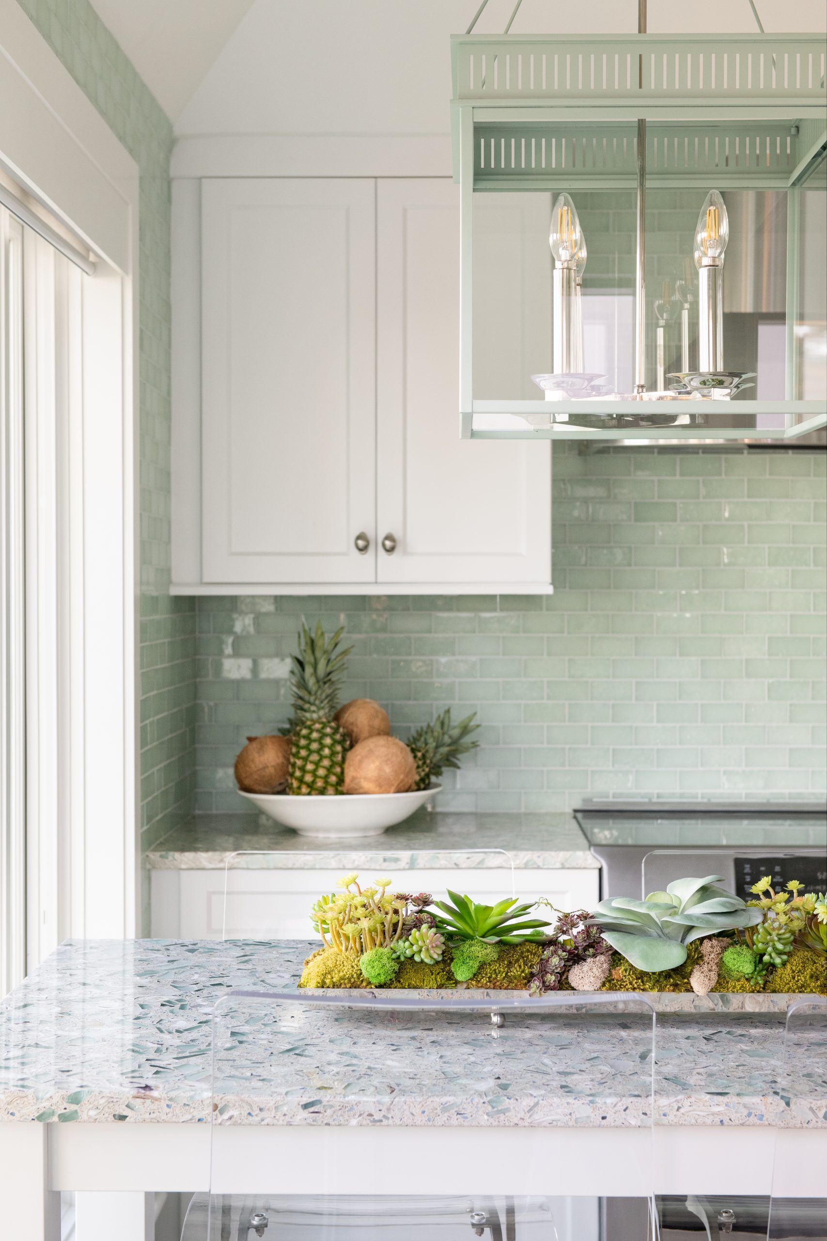 Speaking of pets, Fulton was sure to include a special treat for the villa owners’ prized pooches. The same Vetrostone festooned with sea glass that comprises the customized pet bowl also winds its way up the waterfall edge of the kitchen’s new counters. These counters serve as a beautiful complement to recycled glass tiles that wind around the kitchen’s walls.