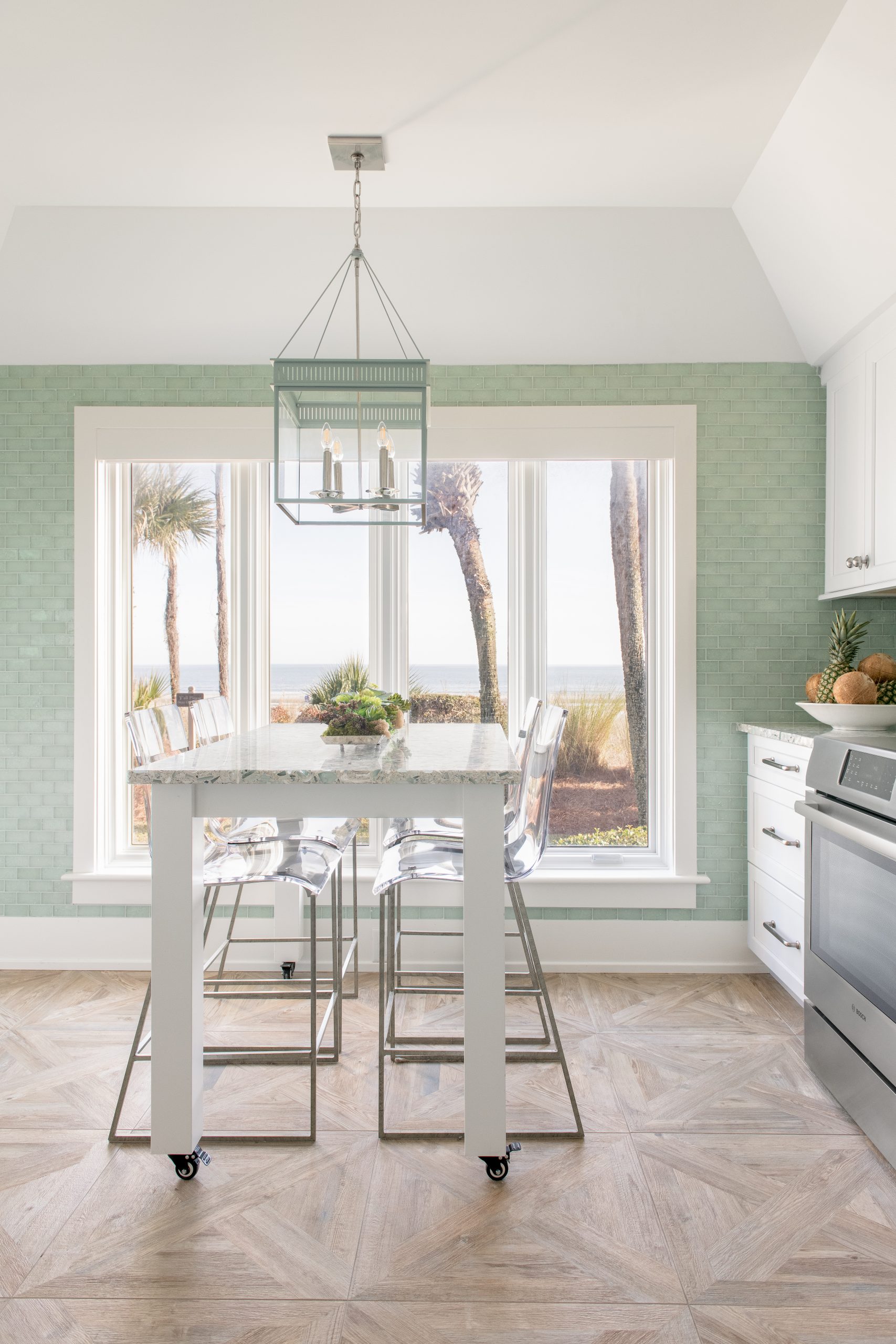“They are our favorite things to rip out,” said Fulton with a laugh. Pulling down the mirror allowed for a fresh and modern shiplap half wall, balanced out with a grasscloth upper wall dyed to reflect a watery, coastal feel. These colors find an elegant complement in the tray ceiling, painted a subdued sea-glass shade during renovations, as well as in the new dining table’s dramatic aqua chair and bright blue seat cushions.