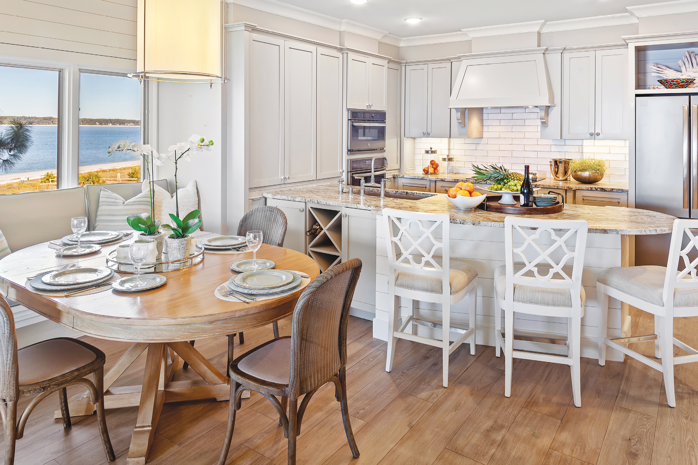 Shiplap ceilings and exposed beams add a coastal custom home touch. An existing wall between the entry and kitchen was partly removed and partly angled away, opening the whole space and view as one enters the villa.