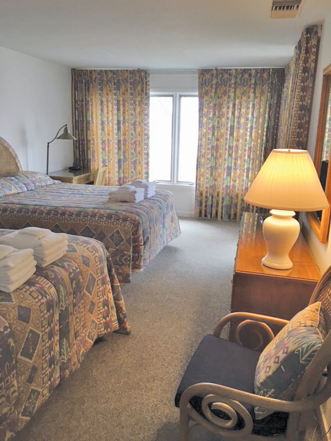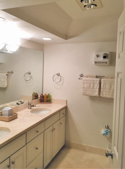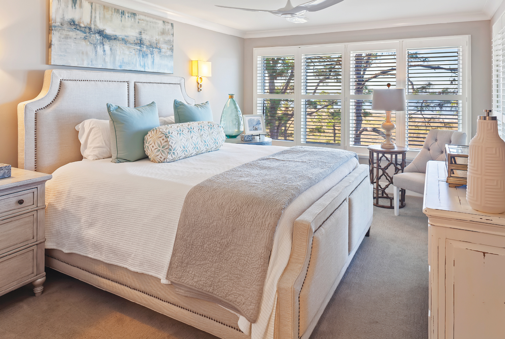 Plantation shutters were added to existing windows allowing for a perfect combination of natural light and privacy when needed, while maintaining the view of the ocean. New bedding featuring layered textures and pops of color offers a luxury feel.