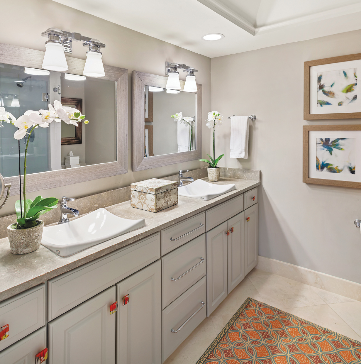 Revamping an existing vanity with freshly painted cabinets, new countertops, and plumbing fixtures revitalized the guest bathroom. The Spricher floor covering (available at Pyramids Hilton Head) is a fun, durable way to add color and design to a room without getting moldy or being hard to clean.