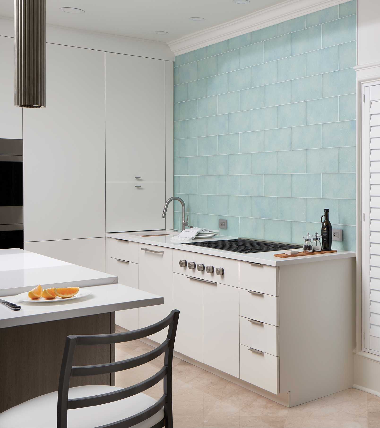 Now freed of both a bulky fridge and massive dark cabinets, the wall adds a pop of color with its aquamarine glass tile backsplash over the sleek induction cooktop from Billy Wood Appliance.