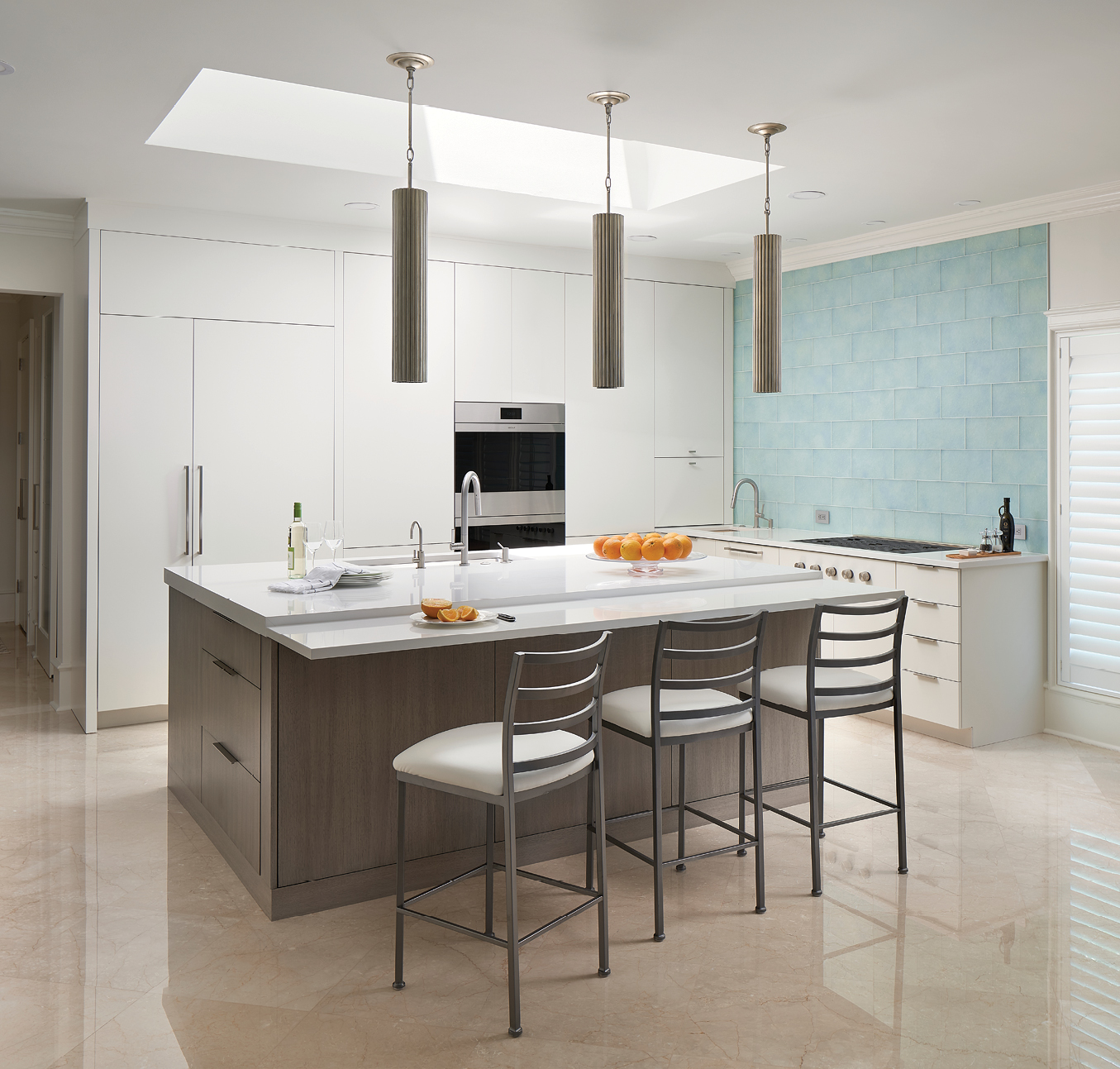 Beyond basic storage, the paneled refrigerators in white complement the custom colored rift cut white oak island. Cabinetry from Dutch Made was chosen to lighten and brighten the space. The first task was finding a finish that worked with the existing flooring, an Italian marble with a slight peach cast that called for a subdued contrast.