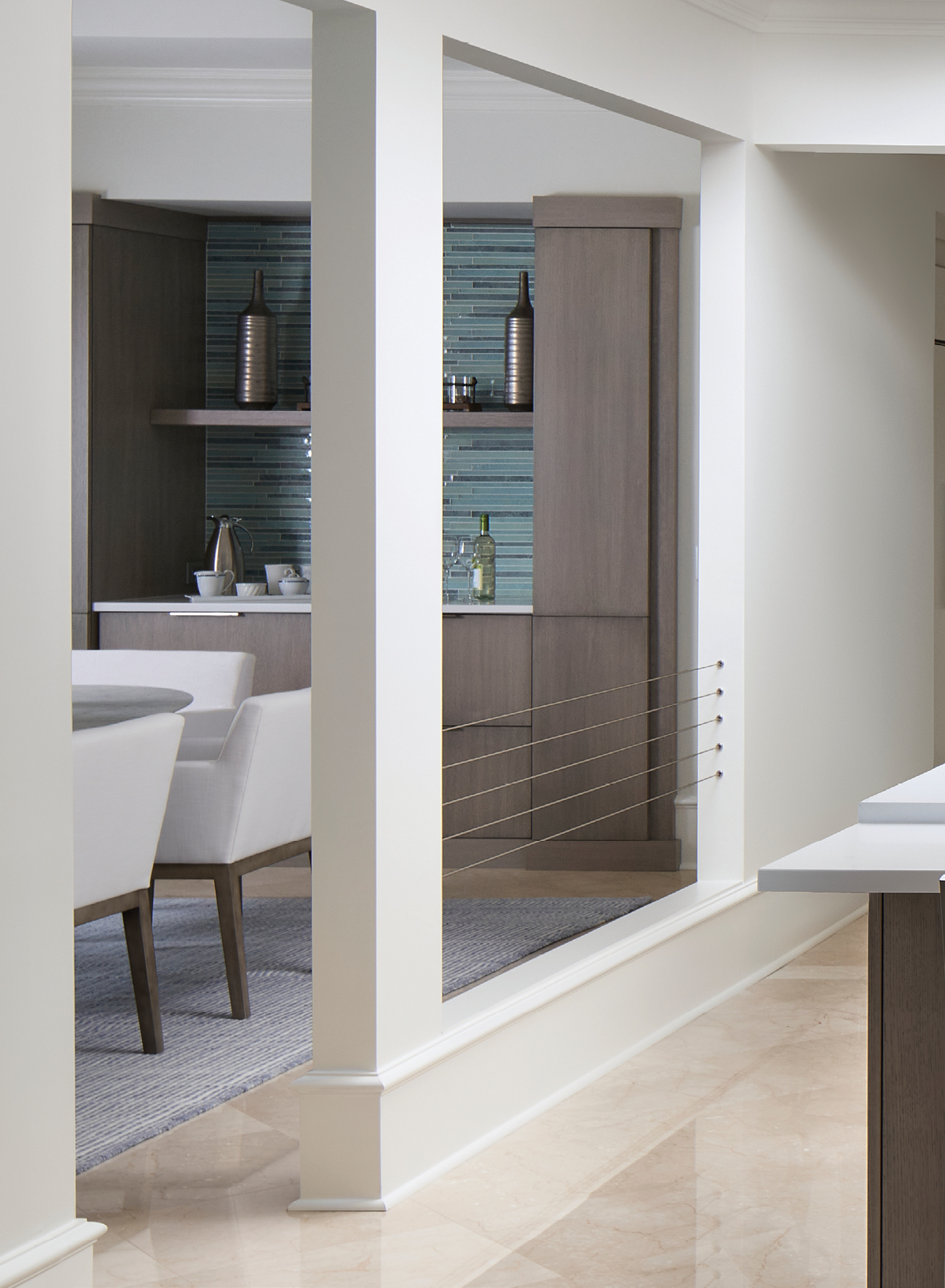 For the entryway to the dining room, Robert Woods of JJ&R Construction was brought in to dismantle the wall of cabinets and its perplexing attached entryway, opening the space between kitchen and living room.
