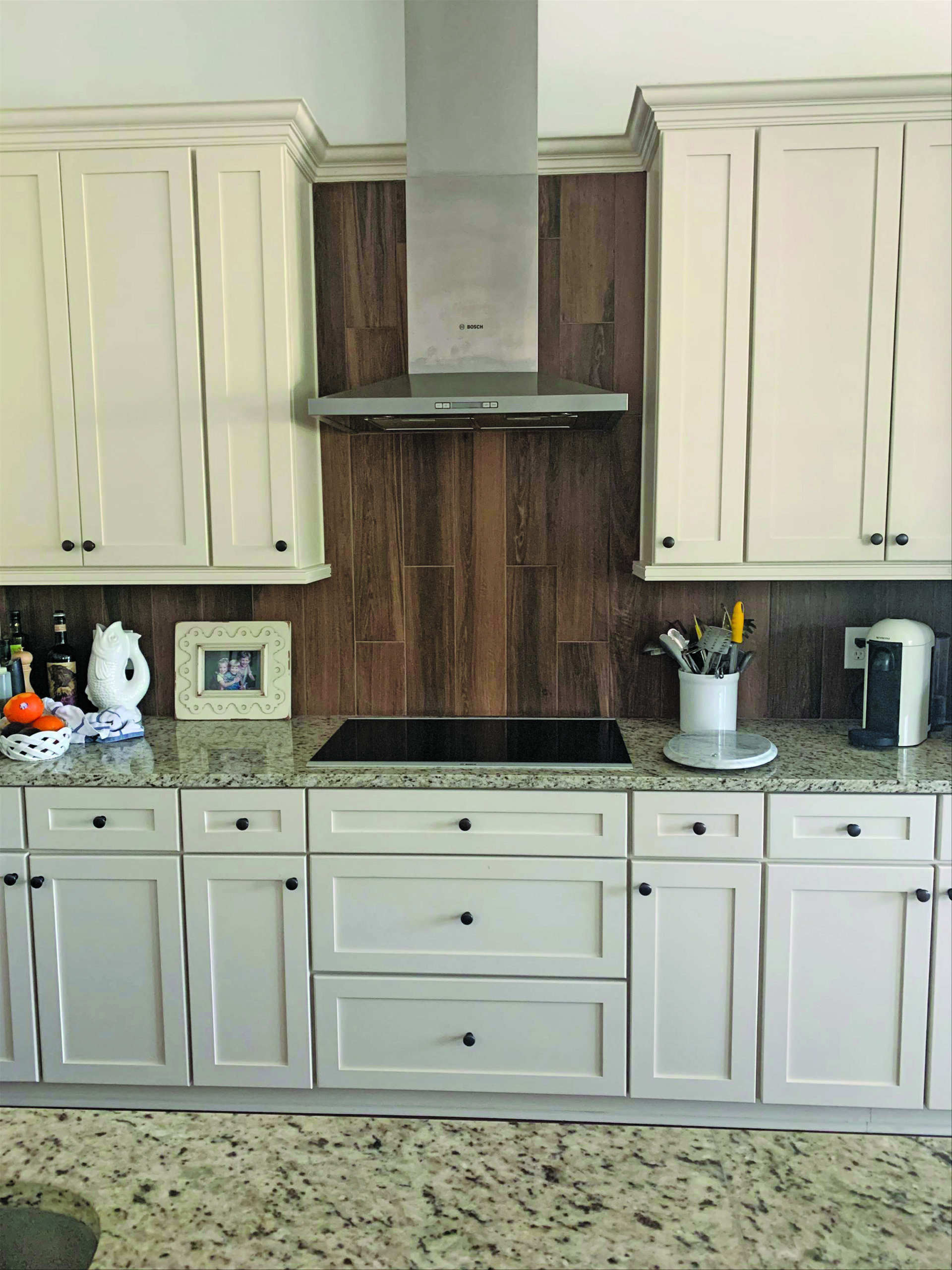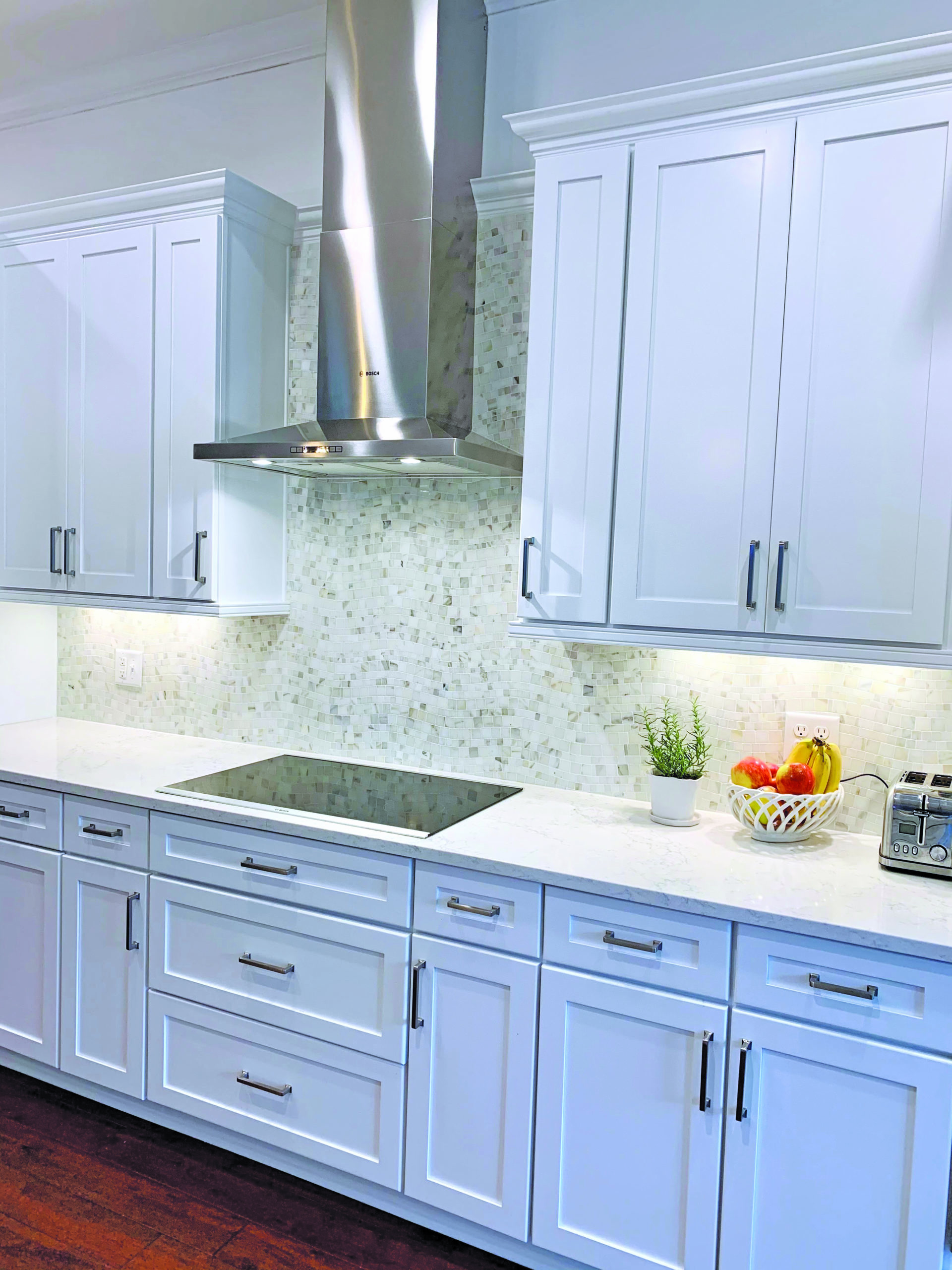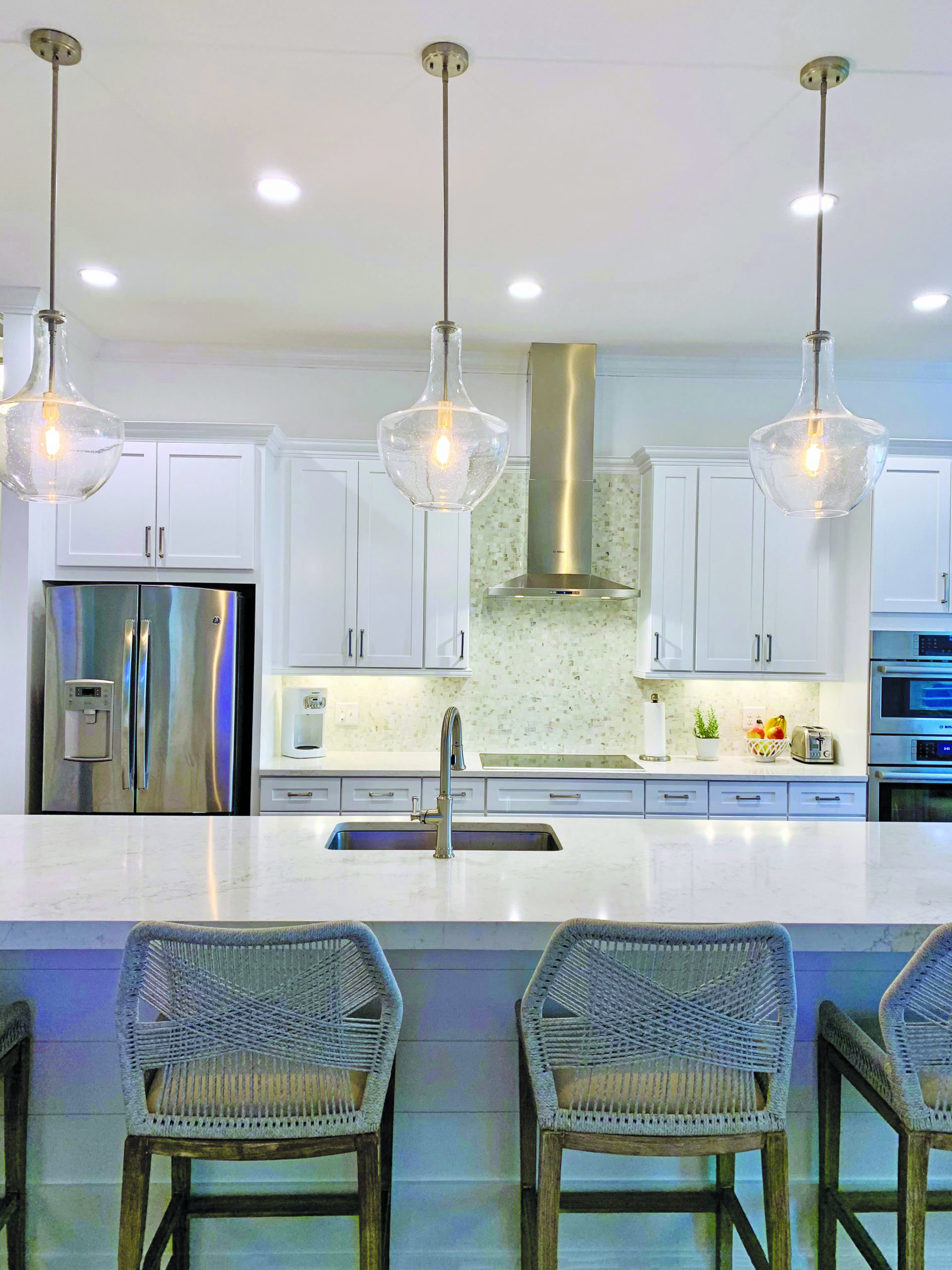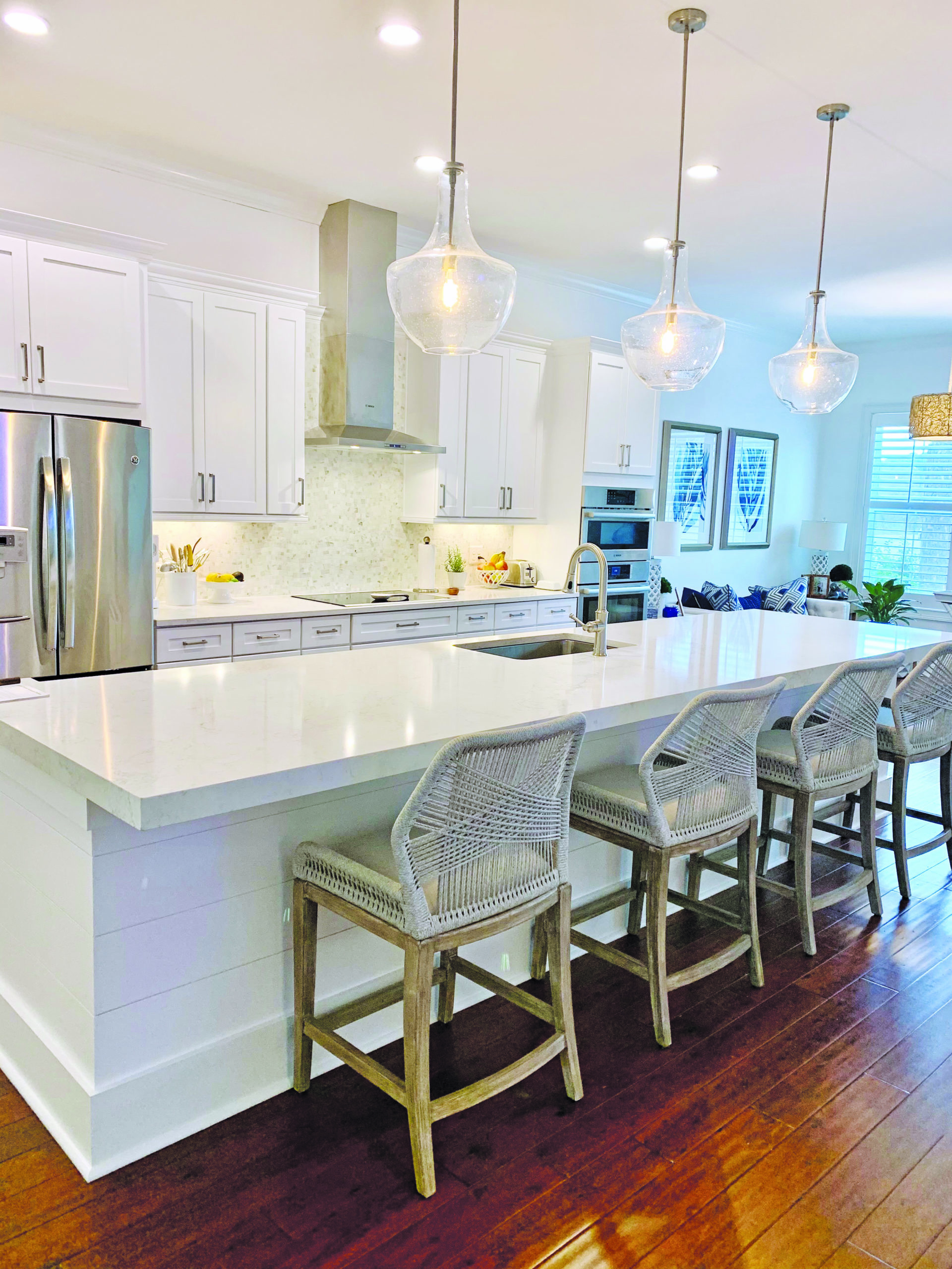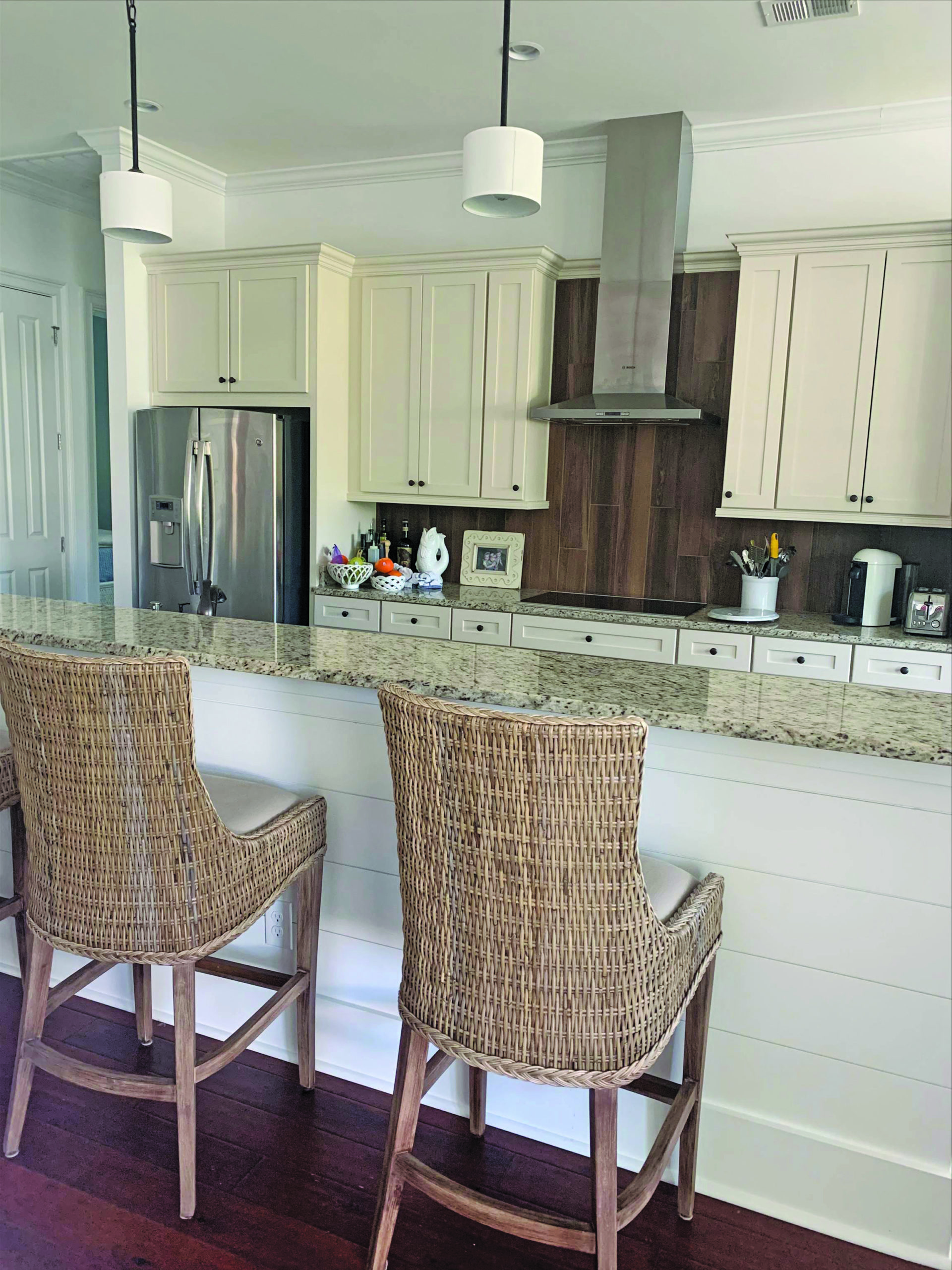 In addition to installing the quartz countertops and backsplash, the owner updated the hardware, painted the cabinets and installed new lighting. She purchased her new counter stools from Coastal Home Furnishings on Hilton Head Island.