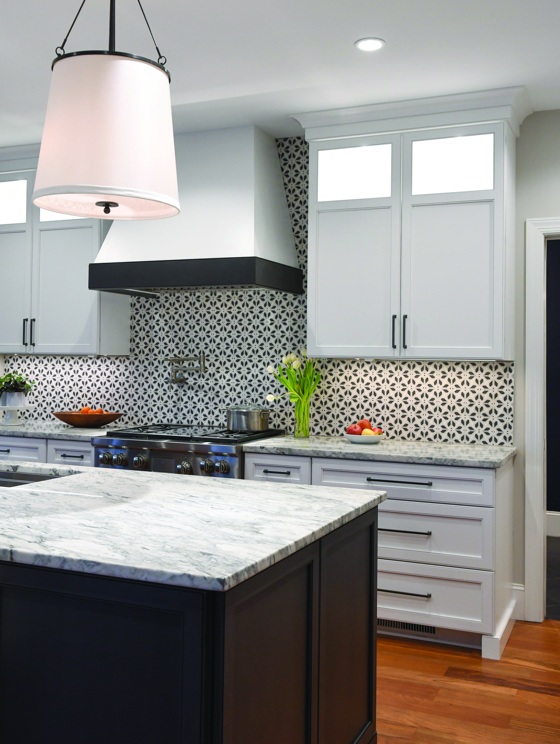 “The original kitchen was done when the clients’ children were younger, and the L shape created quite a few traffic jams,” she said. “Changing the configuration to a galley with an island with seating really opened the space to the way the family uses it. We took away some counterspace but made the remaining counterspace much more usable.”