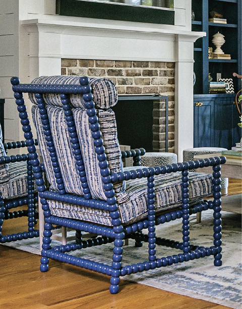 “Her house is not boring at all. I think it’s really comfortable. I love that she let us use color to add some interest in her living room,” said Caron. That includes a set of spool chairs tailor-made for the home and hand-painted to match the palette of blues and whites. “We had those custom made to match her built-ins.”