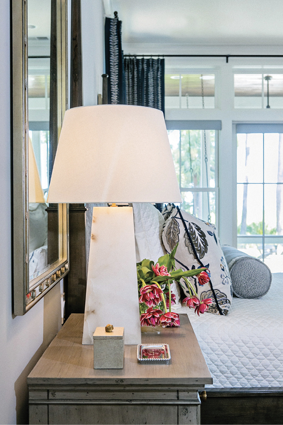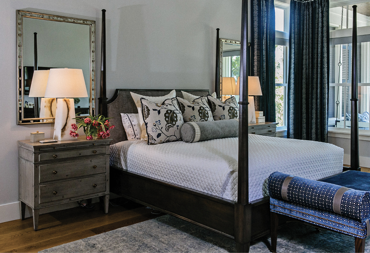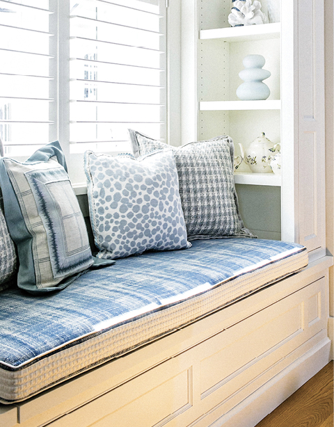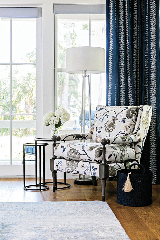 “She loves the color blue,” said Caron. The color runs throughout the house, from the royal blue shade on the built-in bookshelves, kitchen island and upholstery to the light cerulean of a window bench or a throw pillow. It’s a color that accents the crisp white of classic Lowcountry décor brilliantly.