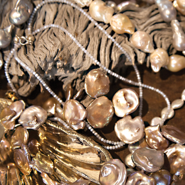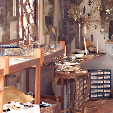 As I walk down the sandy driveway to Gogo Ferguson’s studio, I’m greeted by deer and horse skulls and the suspended skeleton of one of the island’s feral equines, a carpet of shells and sun bleached bones spread beneath. Necklaces, earrings, bracelets, rings, cufflinks dazzle in display cases amid shells, bits of antlers, and other natural artifacts.