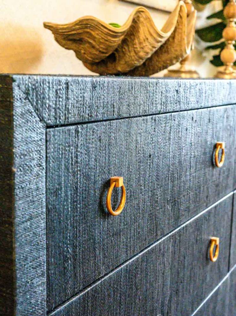 Textured furniture remains a prominent trend in the home market. It helps bring visual movement about the room, adding variation. The navy linen-textured dresser showcased in the bedroom echos blue throughout the space with complementary bronze hardware that resonates with the comforter’s warm tones. Beyond textures, patterns can be crucial in accentuating the room’s aesthetic. The homeowner opted for a patterned side dresser with a lacquered finish to complement the colors and textures in the room.