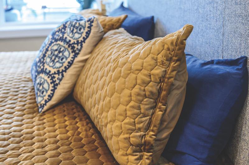 The symphony of textures in the room begins with the bed. The texture of the luxuriously soft velvet comforter, paired with the contrasting Chevron fabric texture of the bed frame, creates depth and refinement in the space, creating an enticing focal point in the room. By juxtaposing textures, it makes certain aspects stand out. Similar to how adding a pop of color can change the mood of a room, contrasting your room’s textures will do the same. Decorative pillows add dynamic color and texture.