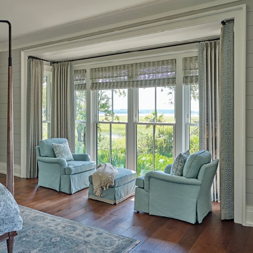 The volume of vertical spaces along with the open floor plan in the main living areas were major considerations by the interior design team as they determined the scale of furnishings for the Eidt residence. “Through the use of printed linen fabrics, rich textured textiles, beautiful hardwood floors, luxe finishes and natural stone features, we created a Lowcountry nuance which feels refined, relaxed and inviting,” said Design Director Deb Van Plew.