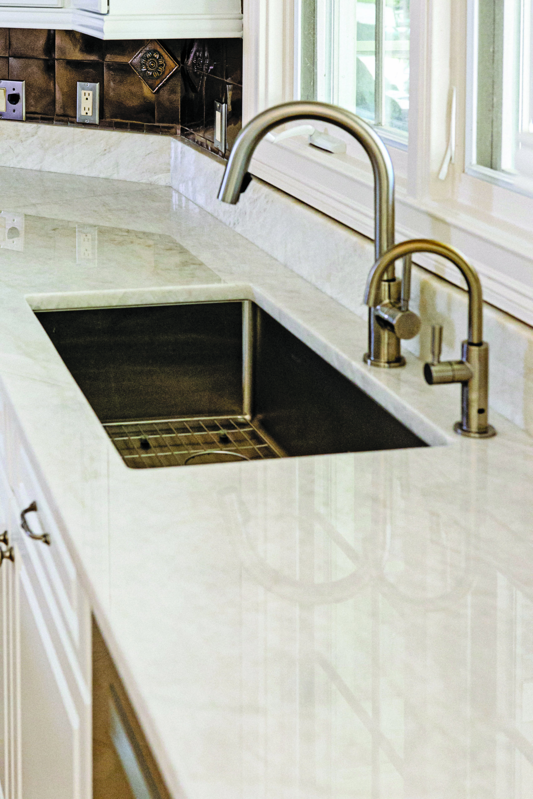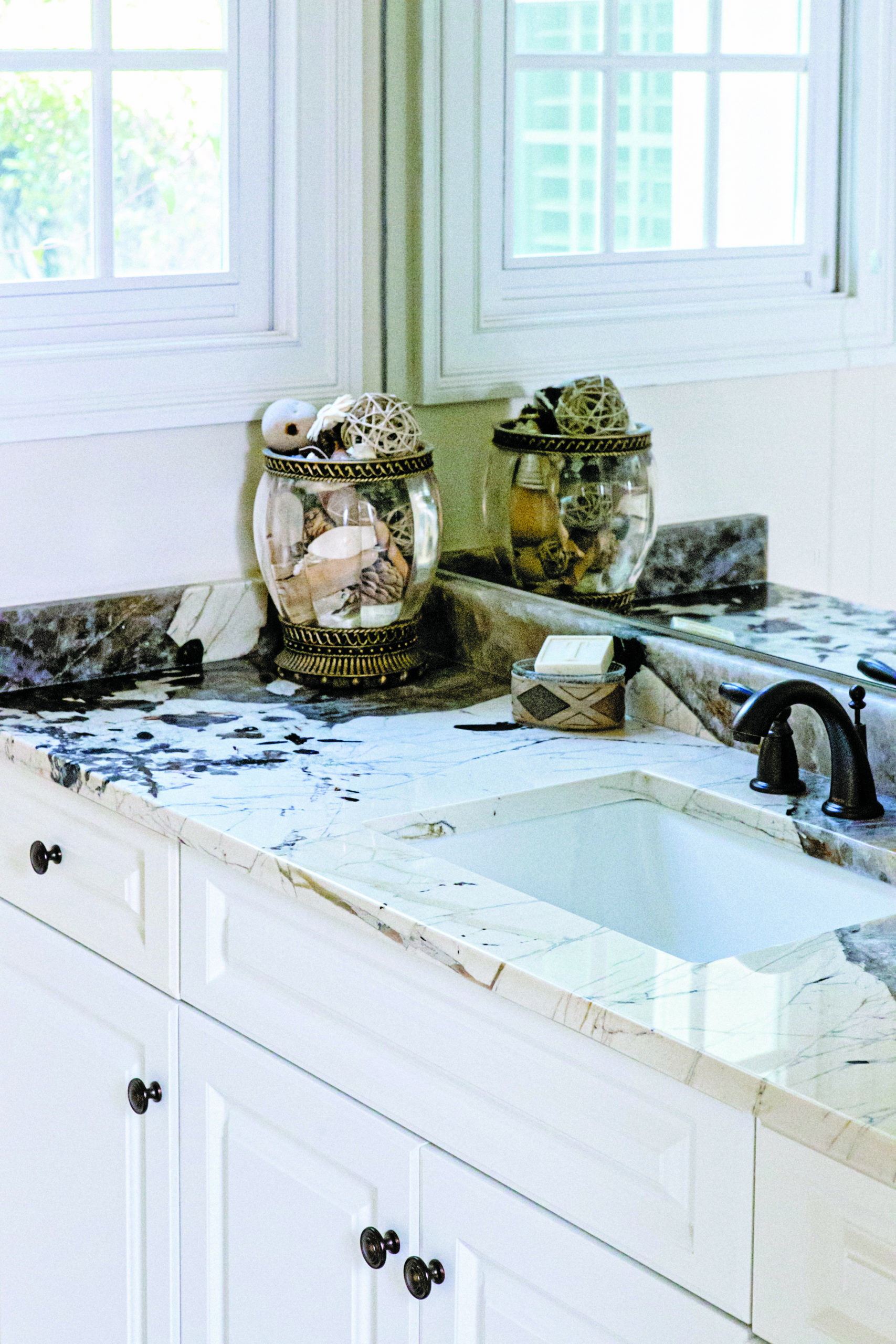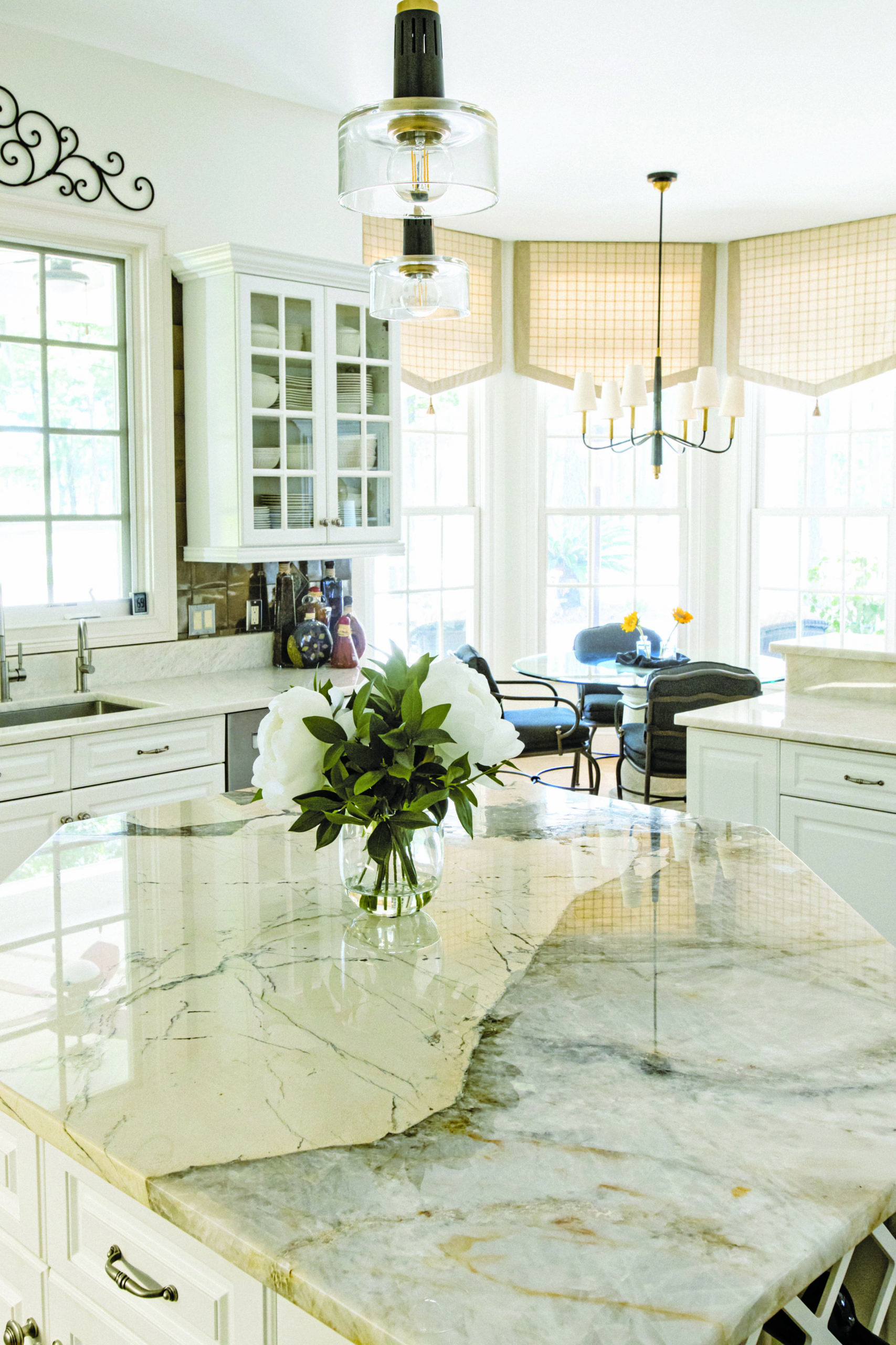 “(The homeowner) wanted something lighter to brighten the space up but also needed stone that coordinated with the rest of her house,” said Distinctive’s Courtney Jansen. “She also wanted a statement piece on the center island and then something calmer for the perimeter.”