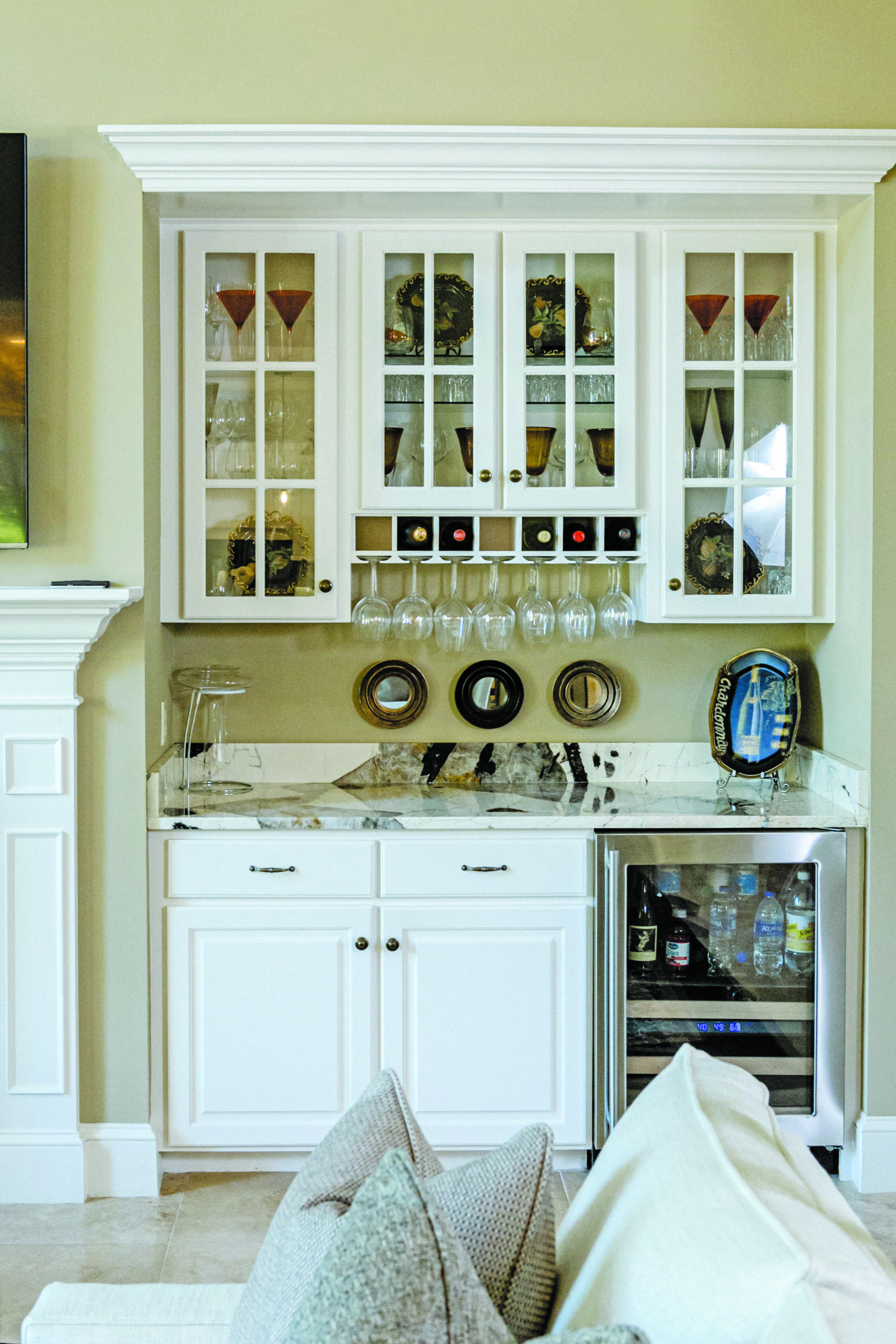 With the bar area visible from the kitchen, the owner decided to replace the countertop with Patagonia granite with an eased edge, just like the kitchen island. Even acidic foods like tomato sauce will leave no mark on the durable and unique-looking surface.