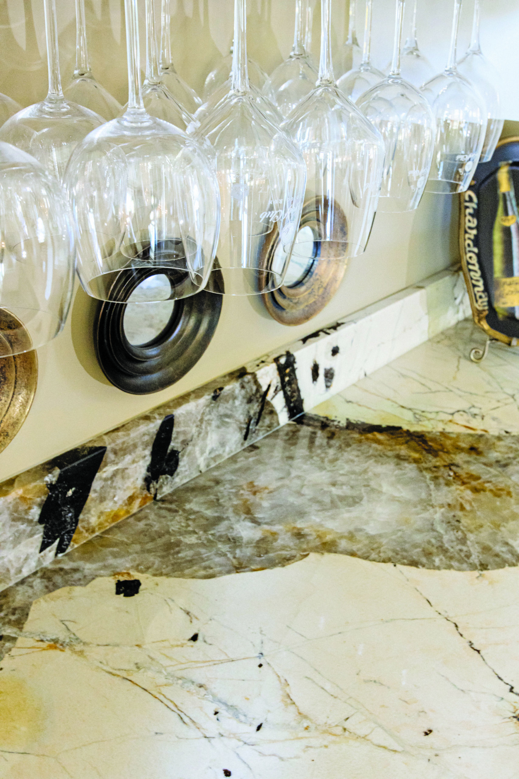 For the island, the owner went with Patagonia granite — a bold, scratch-resistant stone with colors and shades mixed in an eclectic fashion. For the perimeter, she selected Fountain Blue, a crystalline quartzite with a glass-like surface.
