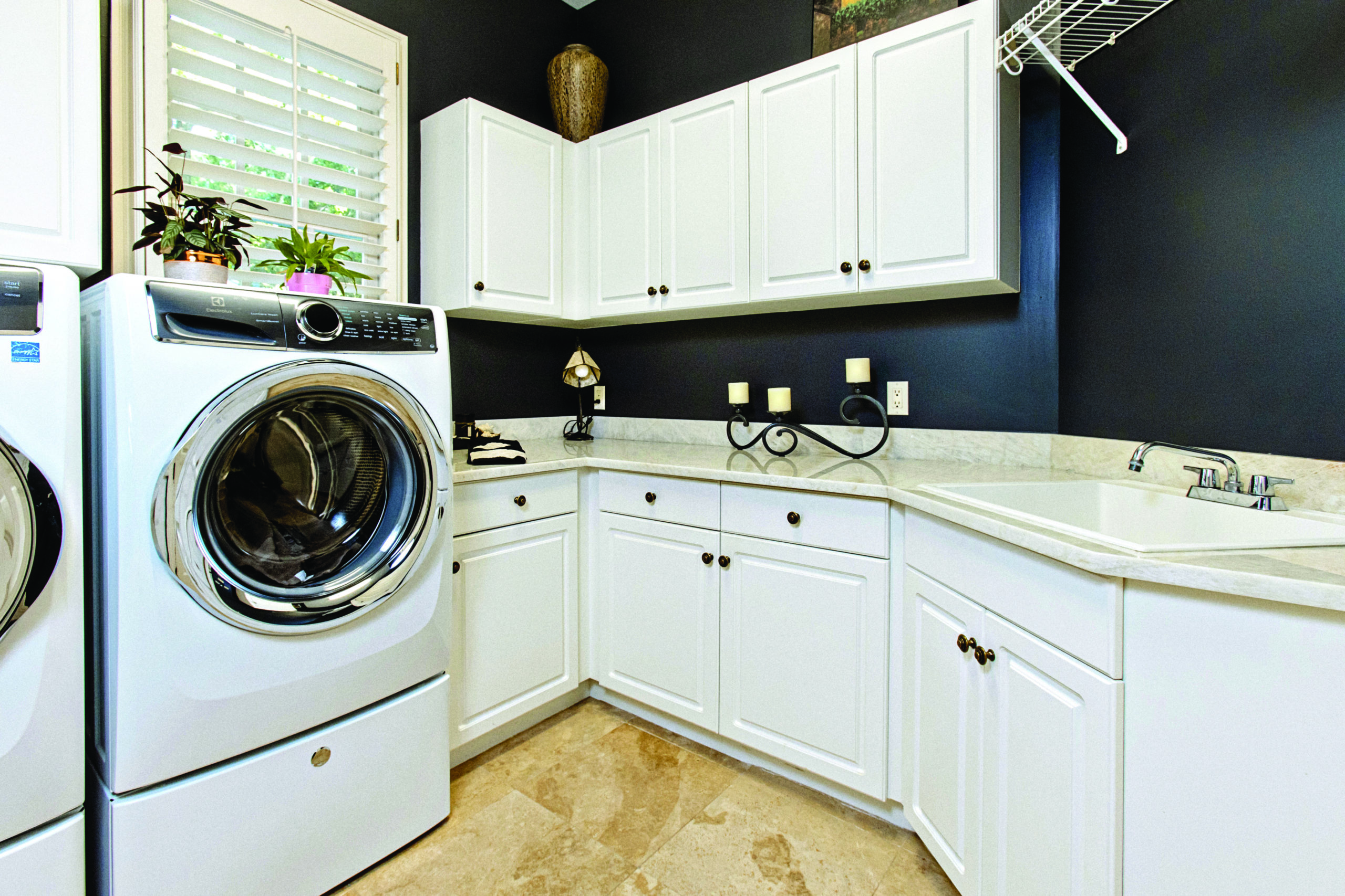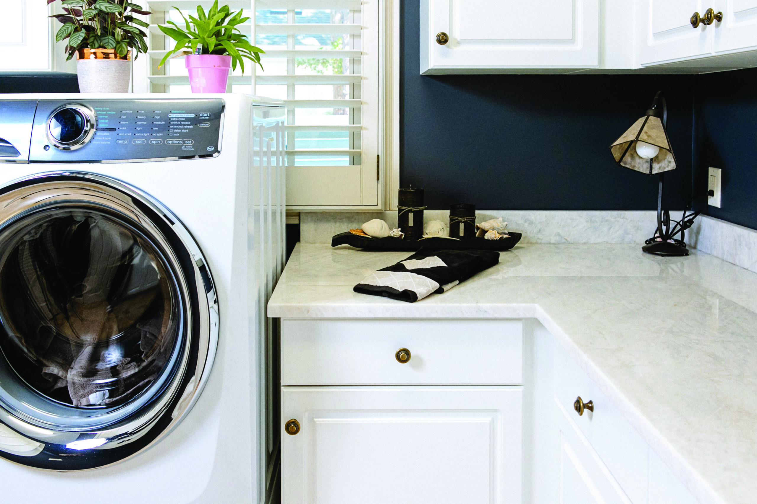The owner decided to upgrade her laundry room countertops with Fountain Blue as well. She then used one of the Patagonia slab remnants to update a bathroom just around the corner.