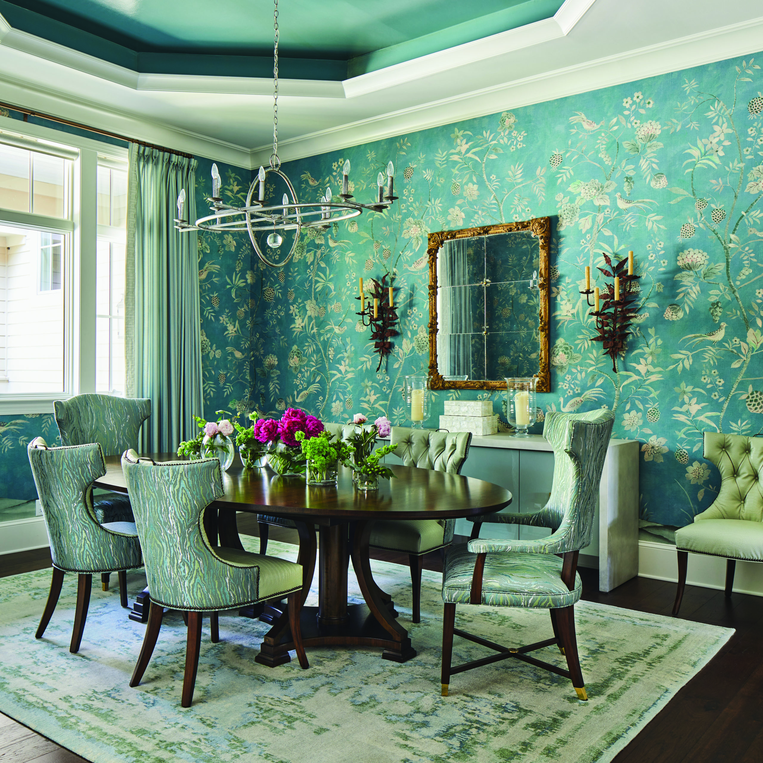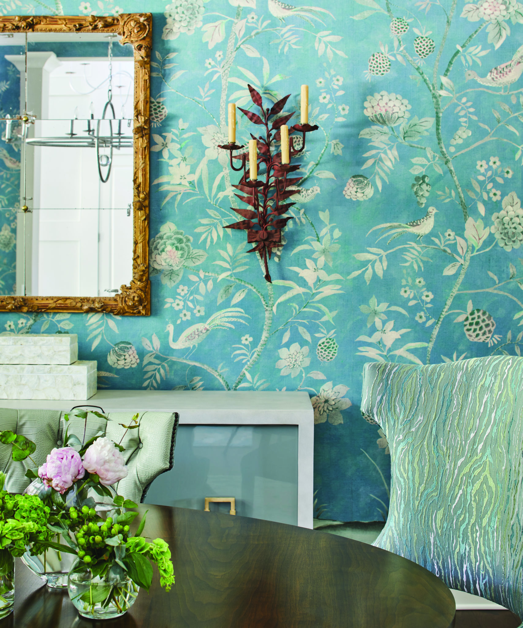 “The wallpaper set the tone for the rest of the house. It’s printed on linen, so it has a gorgeous texture when you view it in person,” she said. “We sourced out antique mirrors and sconces to juxtapose with the modern chandelier, and it worked beautifully.”