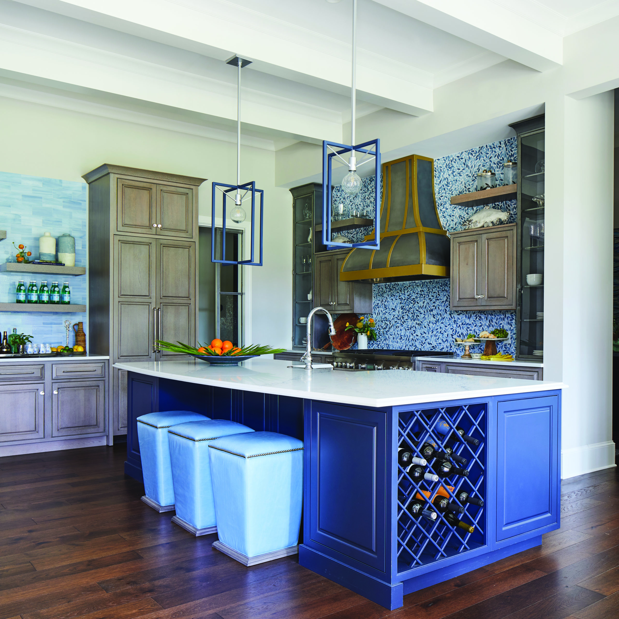 When working with bold colors, it’s important to balance out your tone of choice with contrasts, either in tone or in texture. Here in the kitchen we see the inspired way Fulton used both to contrast an eye-catching blue center island. Between the bold stainless and brass of the range hood and the fun patterns of the back splashes both in the kitchen and in the bar, this kitchen revels in artistic details.