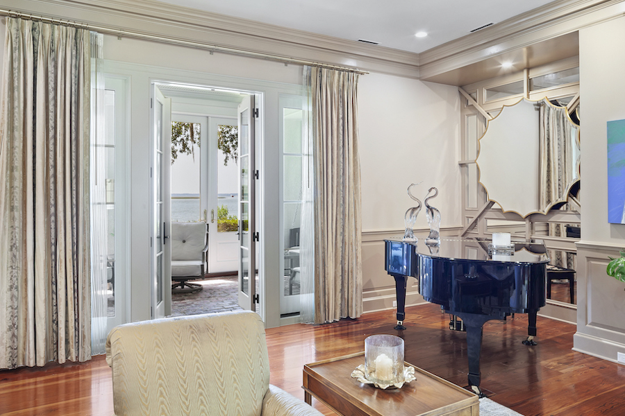 A sculptural mirror, the shine of the baby grand and soft drapery layers create a quiet moment of glamor in this Brams Point living room. Balanced accents and warm neutrals keep the space serene, while the open French doors frame a calming Lowcountry view.
