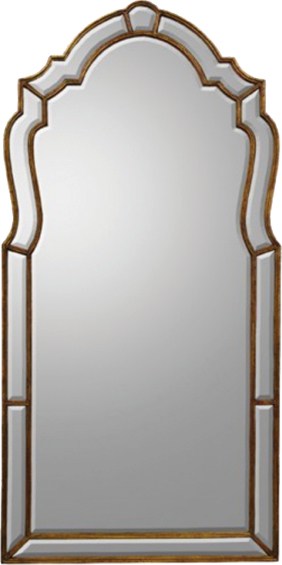 This Keyhole Mirror beveled center mirror is surrounded by various-shaped beveled mirrors in a classic wood frame. johnrichard.com