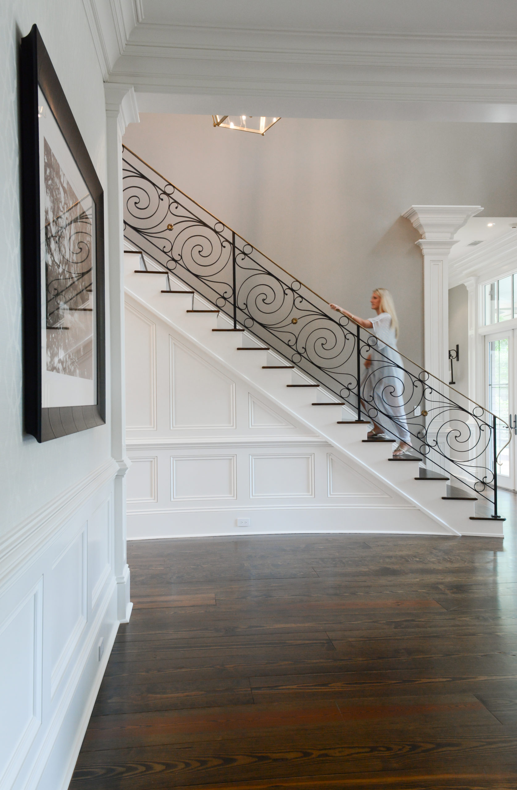 A luxury resort developer based in Miami, Fernandez was relentlessly committed to spectacular first impressions at her new Palmetto Bluff address. Hence the majestic front entry also received a face-lift with pearl-white paint, impeccably intricate molding and an exquisite antique brass Visual Comfort chandelier to offset the regally winding staircase that climbs to two-stories to the Ben Ham gallery. The combination of ascending grace and grandeur is simply breathtaking, as planned by Caron.