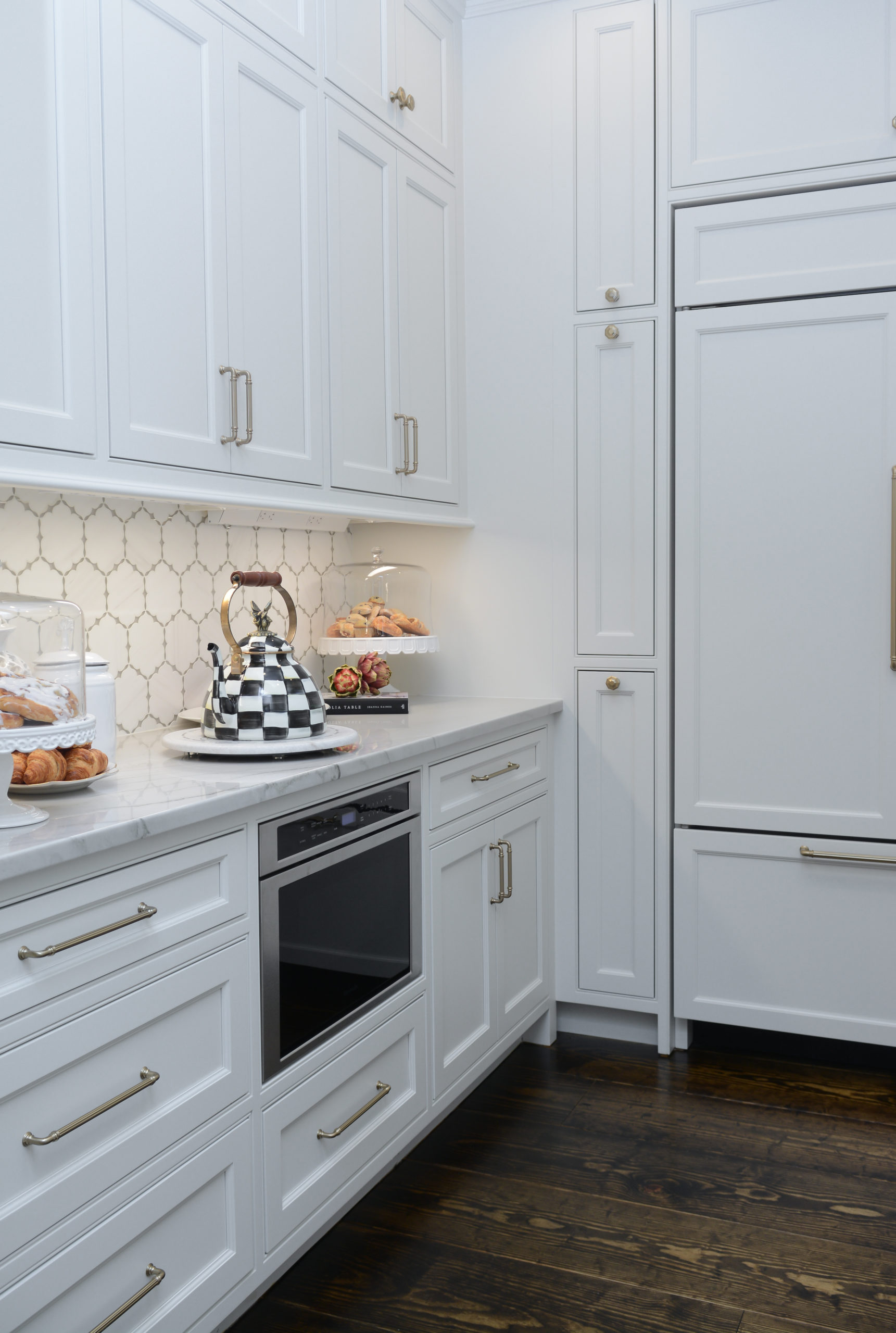 Meanwhile in the adjacent kitchen, the homeowner’s request for an extreme upgrade unveiled repurposed counter and island landscapes plus the addition of a stunning Francois & Co. cast stone range hood illuminated by thoughtfully reconfigured recessed and pendent cone lights.