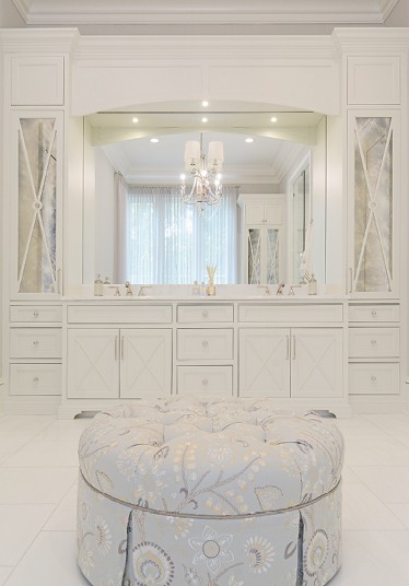 Reoccurring themes of brilliant white, mixed metals and ethereal fabrics reach a crescendo in the master bedroom and en suite. “This intimate retreat quickly draws you in with its marsh views, vaulted ceiling, fireplace and canopy bed,” said Caron. “We further elevated the old-country European vibe with an ornate crystal chandelier, Italian linens and layering of fabulous finishes.”