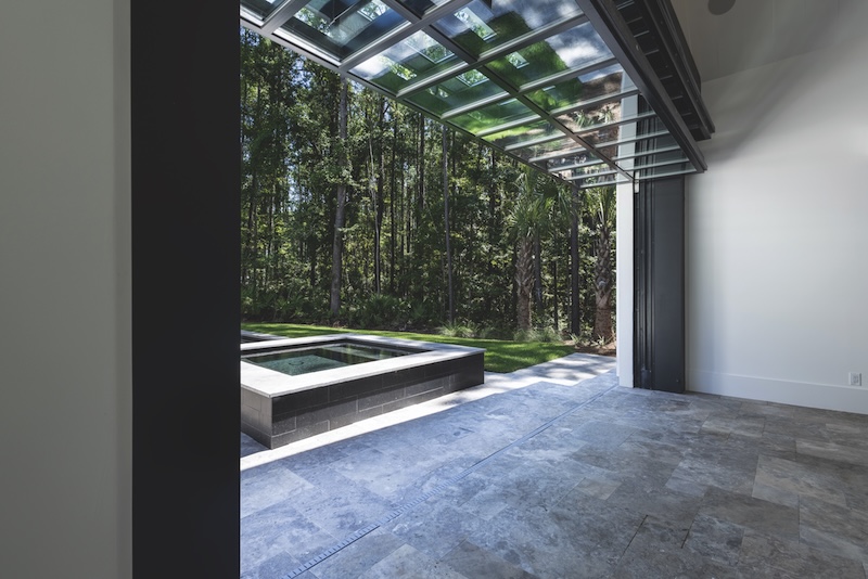 To fulfill that multi-faceted goal, Front Light built the cabana seen here at the edge of the pool. Built on a specialized hydraulic system that lets it fold up and out of the way, the massive metal door ensures that football parties can carry on even into the coldest stretches of the post-season.