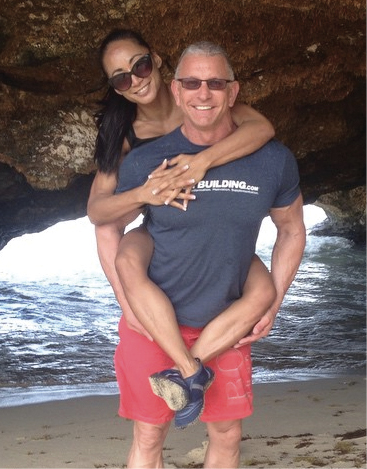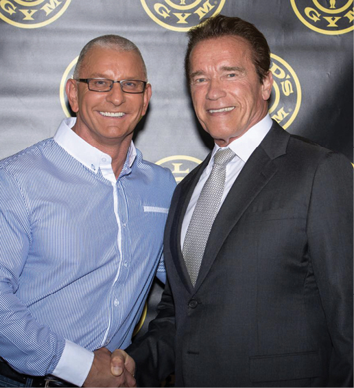 MUSCLE MEN and WOMAN Irvine is shown with Arnold Schwarzenegger. Irvine’s wife, Gail Kim, is a famous professional wrestler. The couple met on the set of Dinner: Impossible, when he came to serve VIPs for WWE’s SummerSlam. He proposed two years later with a chocolate diamond. Guy Fieri (right) was best man at their 2012 wedding.