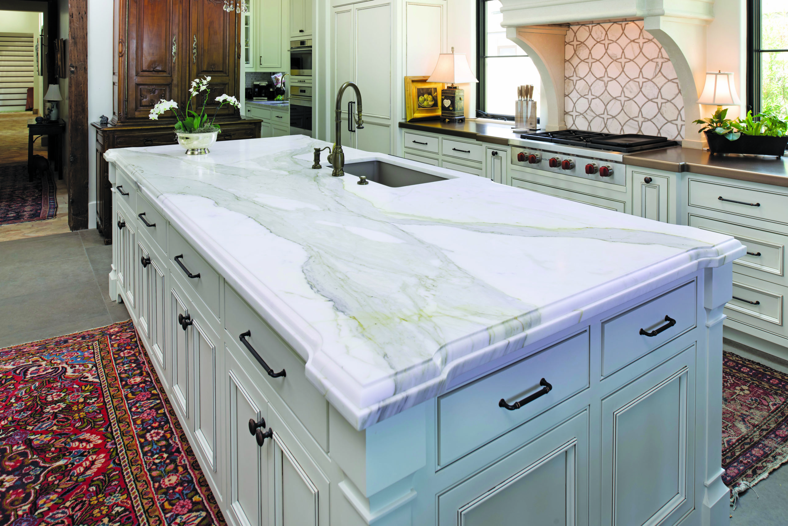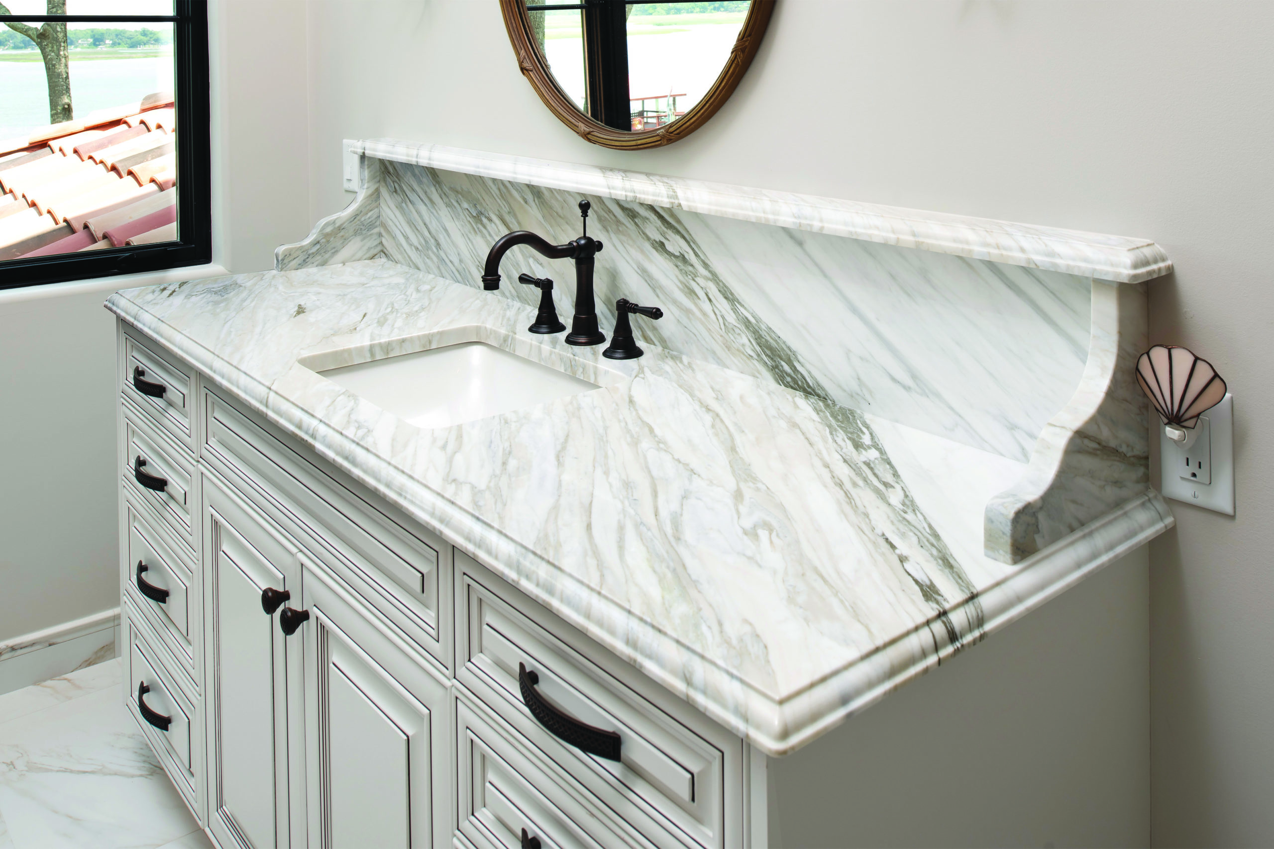 In the bathroom, the Calacatta Gold Classic Marble Double Ogee is complemented with scalloped corbels to support the custom shelf above the splash. Calacatta Gold Bettogli Extra Honed Finish is used on the kitchen island with a laminated DuPont over the