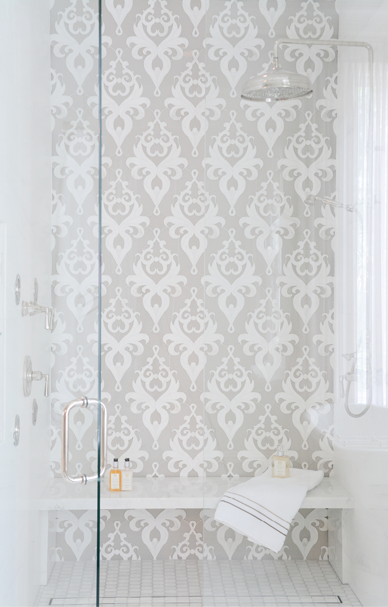 Shower in Luxury When creating a shower feature wall, incorporating the same natural stone in the rest of the space, in this case, dolomite marble, ties everything together for a cohesive look.
