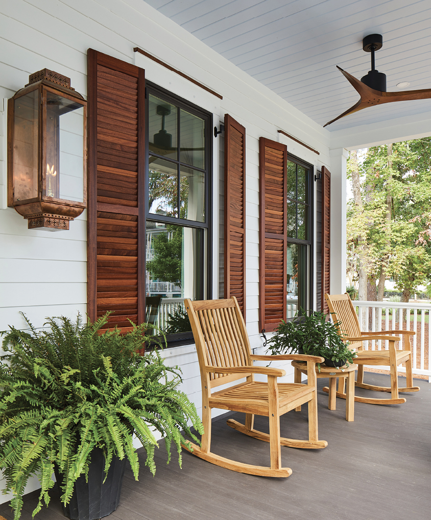 But that doesn’t mean one can’t find gorgeous natural wood, too. It’s right there with the mahogany front door and functional hurricane shutters, tooled at Grayco’s local millworks. The beautiful, rich wood is bathed in light from the copper gas-flame lanterns made by Carolina Lanterns, called, naturally, “The Beaufort,” that frame the door.