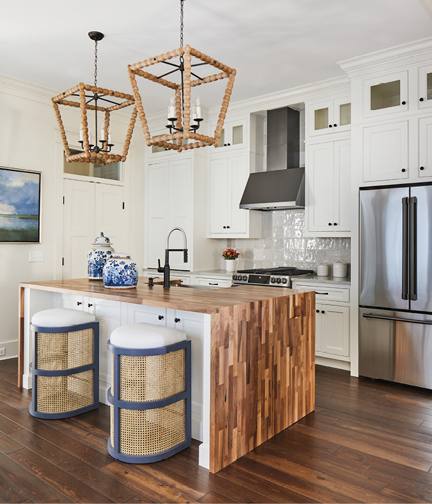It wasn’t just color that Lott used to add a little punch to the Lowcountry look. There is nothing subtle about the custom-made, butcher-block waterfall island, created board by board by Lamon Luther Cabinetry in Georgia. Suspended over it is a pair of rustic lights made of rough-hewn dowels and metal framing by Regina Andrew Detroit.