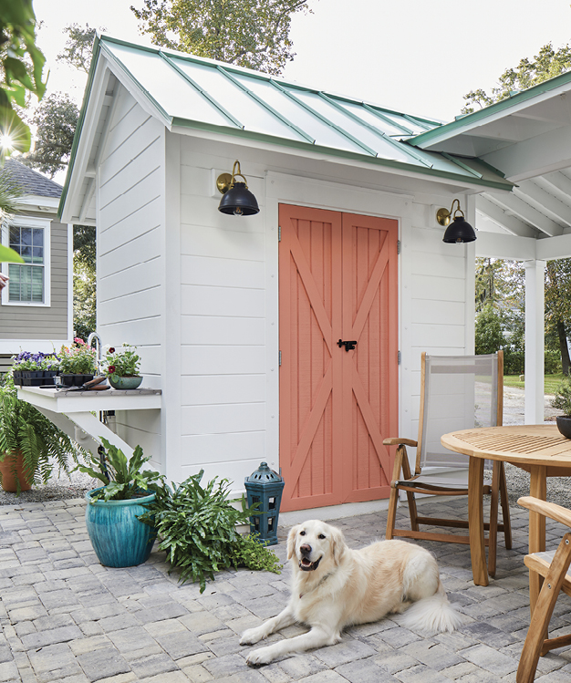 Outside, one will find more surprises, from the copper flashing over the French doors to the screened-in porch and window trim or the galvanized sink on the potting shed.