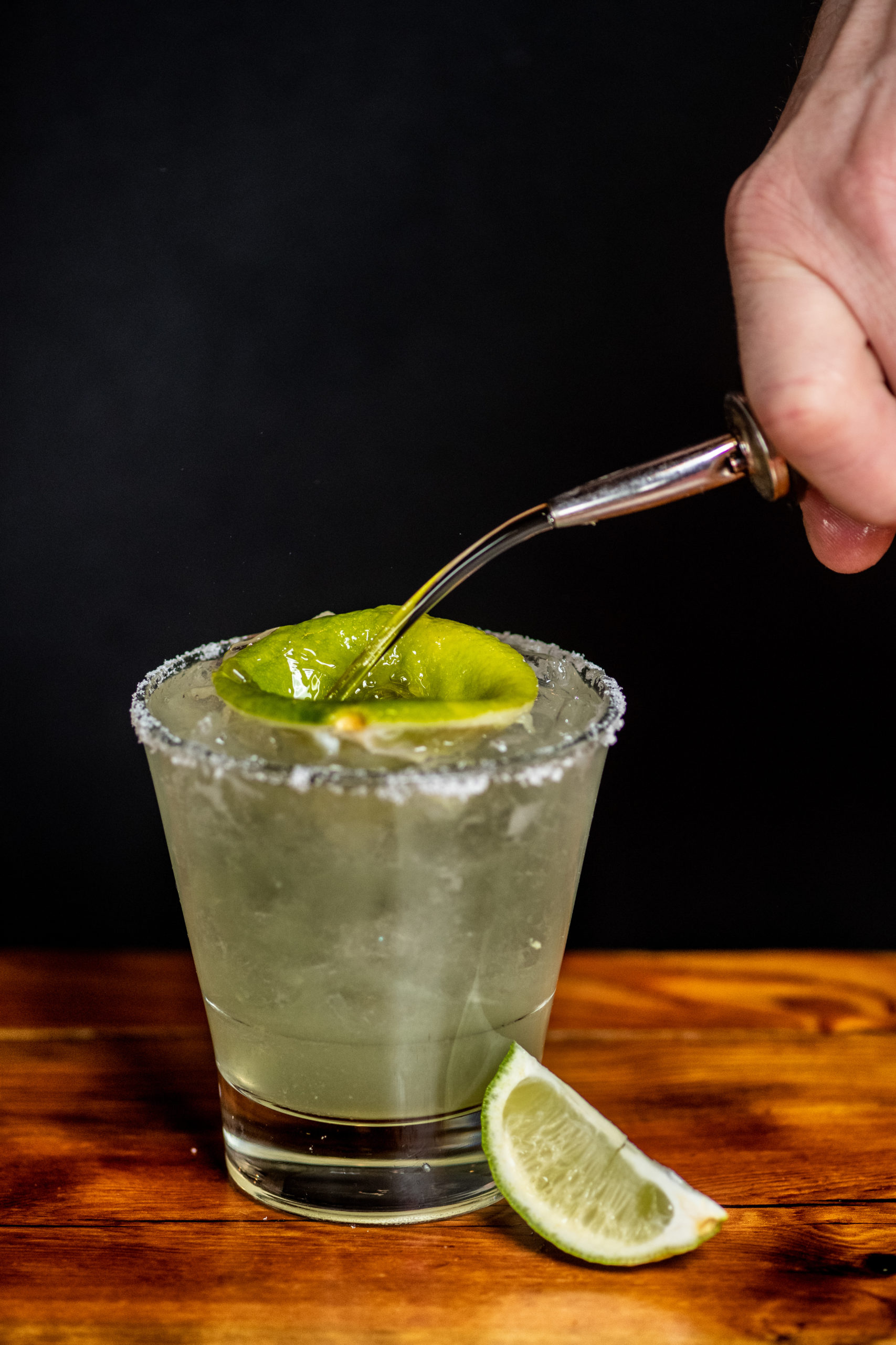 Directions Combine lime juice, tequila infusion, Chartreuse and Agave Nectar in a Boston cocktail shaker with a rocks glass amount of crushed ice. Shake well. Pour contents into a rocks glass, salted rim if preferred. Take the lime that was juiced and place on top of cocktail. Fill it with 1/2 ounce of Don Q 151 rum and light it for presentation.