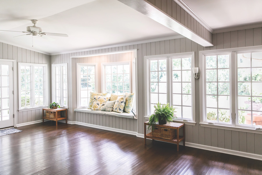 This is a palette that works best in rooms with good natural light and architectural detail. By allowing brightness to lead the design, it becomes an especially smart update for spaces with tongue-and-groove paneling and an abundance of windows. In the room shown here, the soft gray walls emphasize the paneling’s vertical lines, adding texture without visual weight.