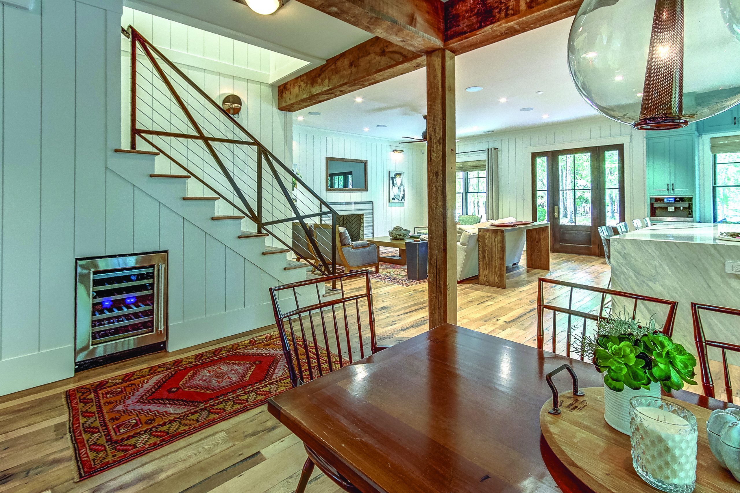 Reclaimed red and white unstained barn oak flooring adds an unpolished natural feel and look throughout the home. Several reclaimed oak beams nudge the ceilings between the kitchen, informal dining room and living room.