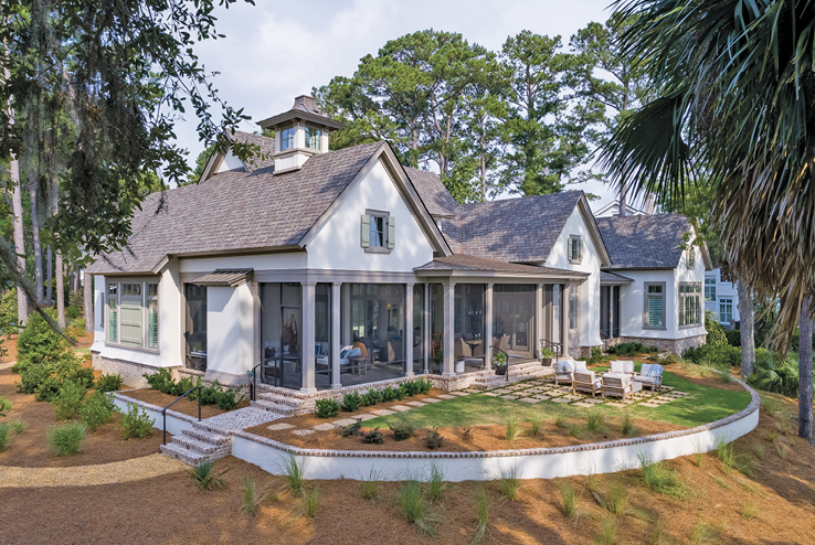Meanwhile outside, another juxtaposition adds refreshing curb appeal to the single-story retreat. “The design features a mixture of old-world charm and Lowcountry elements,” Court said. He’s referring to the smooth molded stucco and graceful sweep of the roofline, accented with exposed roof rafter tails that are akin to coastal South Carolina vernacular. Another unique feature of the home is its raised, landscaped rear terrace that has a coveted setback of just 30 feet from the water, as opposed to the Lowcountry standard of 60 feet.