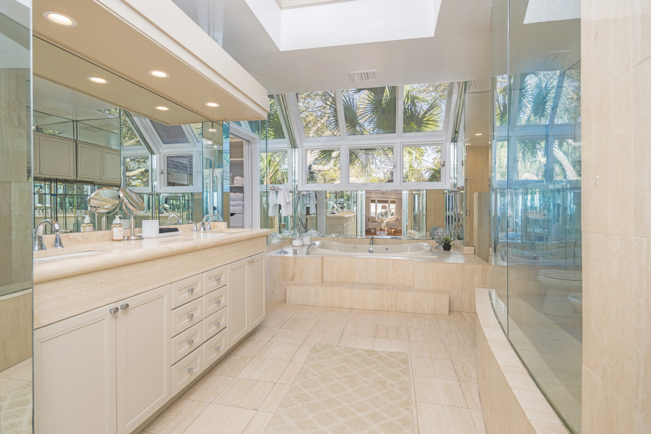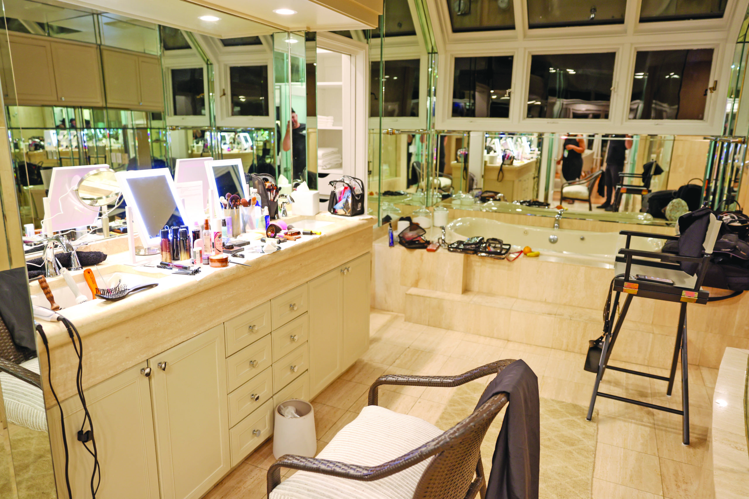 The grand formal dining room served as a production office with a bank of iMacs replacing the table settings. The grand master bathroom became a makeup studio for the hosts, easily accommodating talent and makeup artists alike. It’s a production that generally takes up a massive studio in Rockefeller Center, but this stunning home served ably as a substitute.