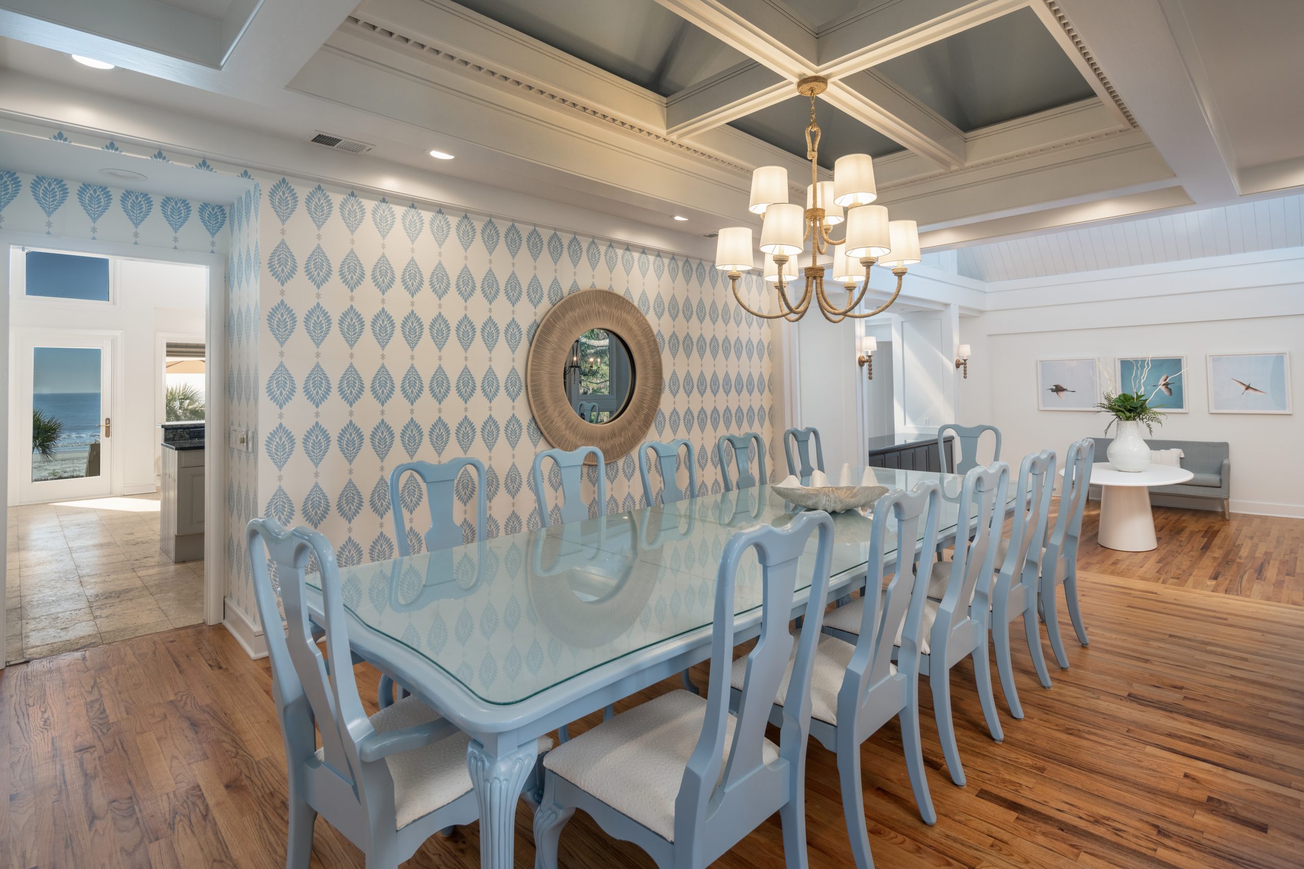Fortunately, the house already focused its design on the water, meaning updating it just took some new materials and furnishings. “Something we went back and forth about was the floors,” she said. “There is a lot of wood flooring in the house, and while it’s not the color we would have chosen if we were doing them new, we kept to the original finish and allocated those dollars to elements such as statement lighting and great art. As it turns out, the floor finish melds beautifully.”