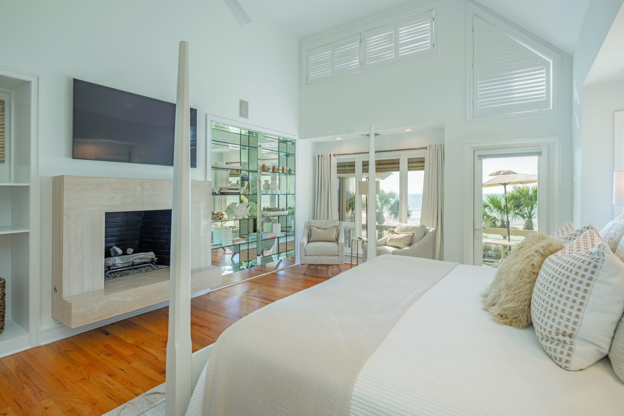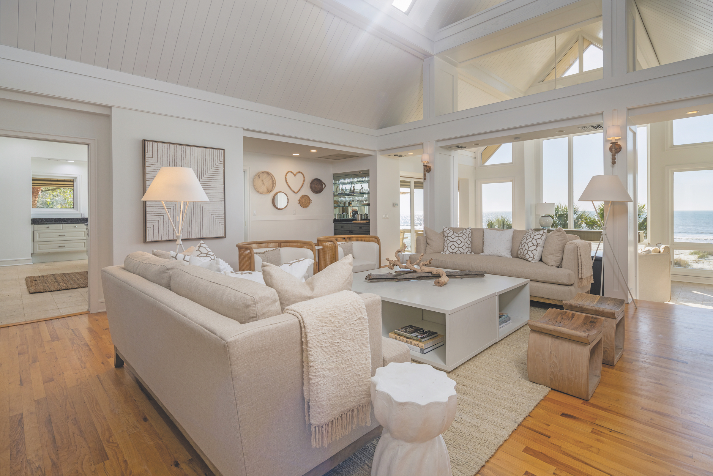 From there she and her team, including Courtney May and Lydia Swank, went to work to take what worked in the house and make it work even better. The lofty, sun-kissed great room Serral calls “the Ocean Room” is a perfect example of this. “We knew we wanted a soft white backdrop on walls and ceilings where the ocean was really the star and then fill it in with comfortable fabrics and soft neutral color tones that feel restful and calming,” she said.
